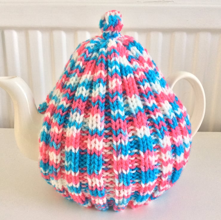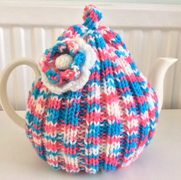 This hand knitted Daisy Tea Cosy, comes in a tweed mix of pink, turquoise and white is topped off with a Pretty Daisy..