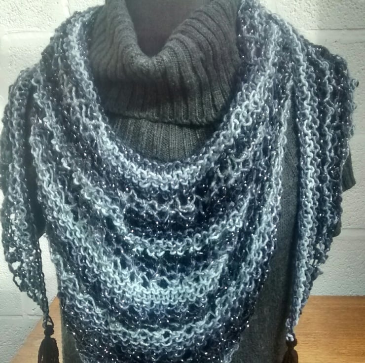 Stylish black and soft greys with a slight sparkle combining to make a beautiful shawl which drapes softly and will compliment many of your outfits.