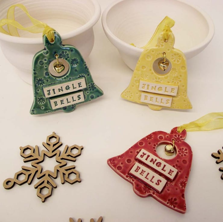 This highly decorative ceramic Christmas Bell decoration is made from white earthenware clay and has a little dangly bell hanging from the middle.