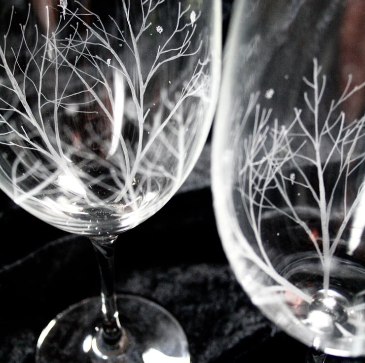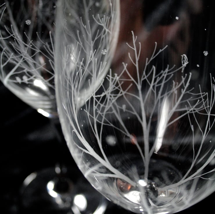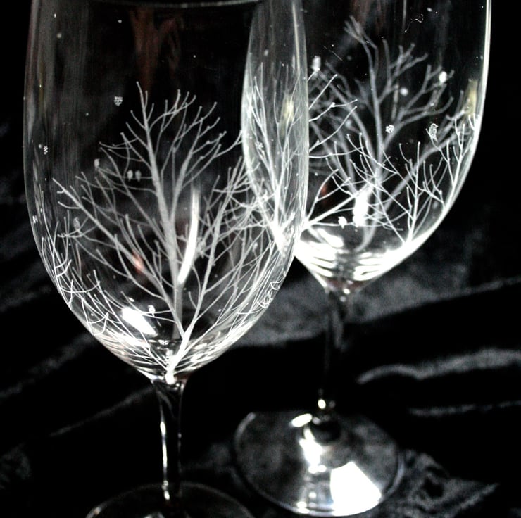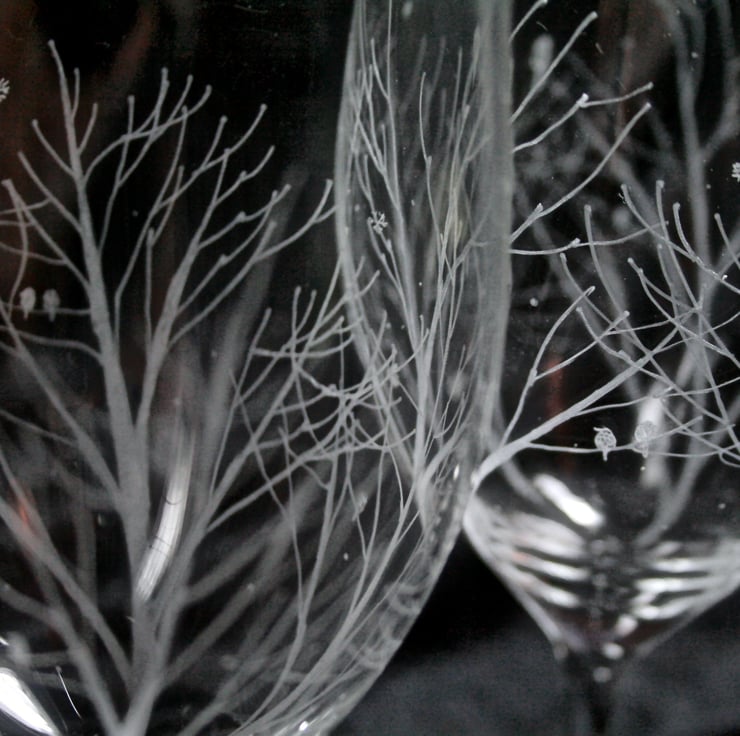 I have hand engraved bare tree branches and little birds onto each glass, along with soft falling snowfall and snowflakes.