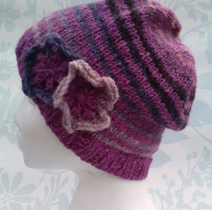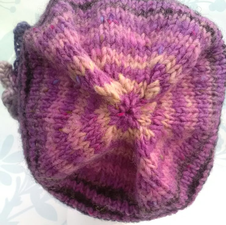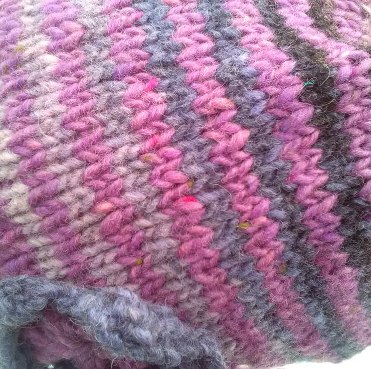 The main colour in this hat is a mauve pink and the bands are purples to pinks to almost black.