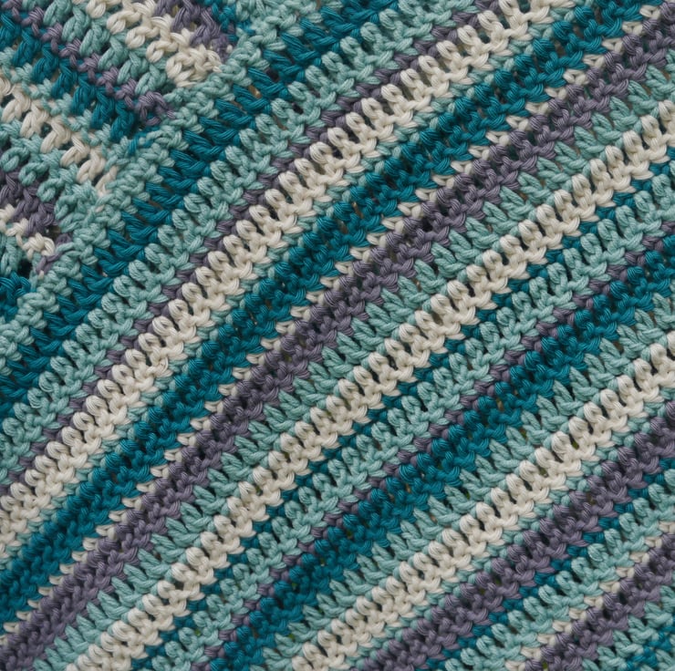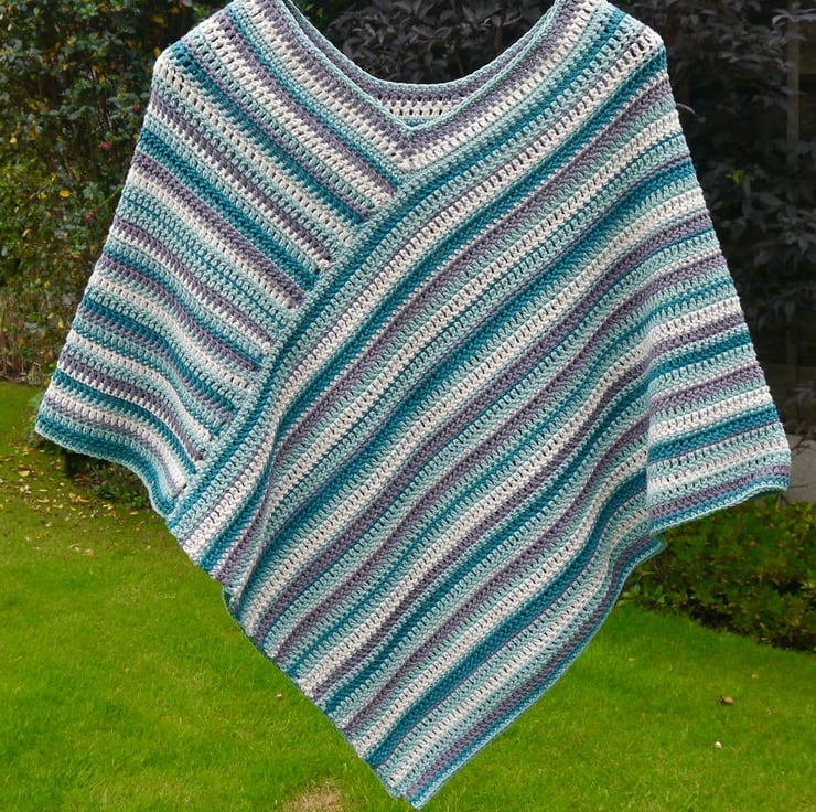 This lovely cotton poncho is crocheted in stripes of grey, cream, duck egg blue and green. It is made using good quality aran cotton making it lovely and warm and cosy.