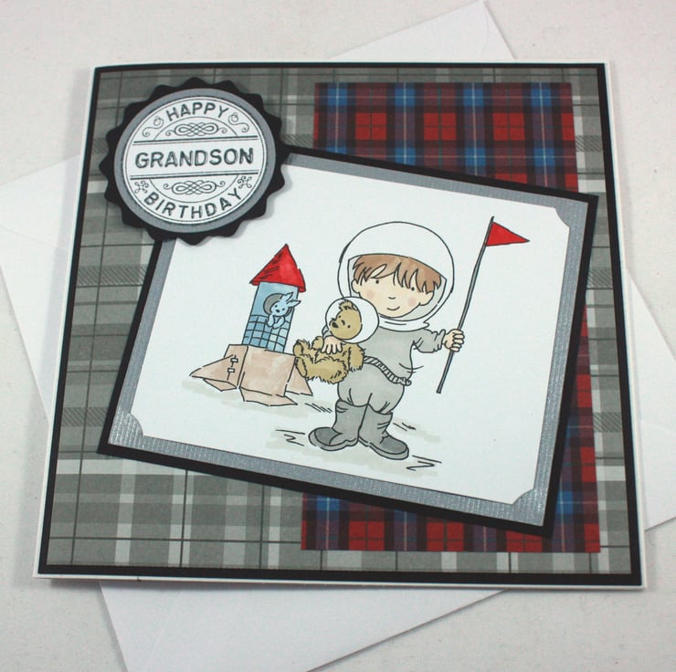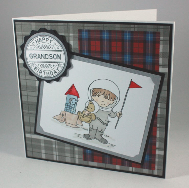 Square birthday card featuring an image of a would-be astronaut with co-pilot teddy and a homemade rocket. The image has been layered onto silver and black card and a background of tartan papers.