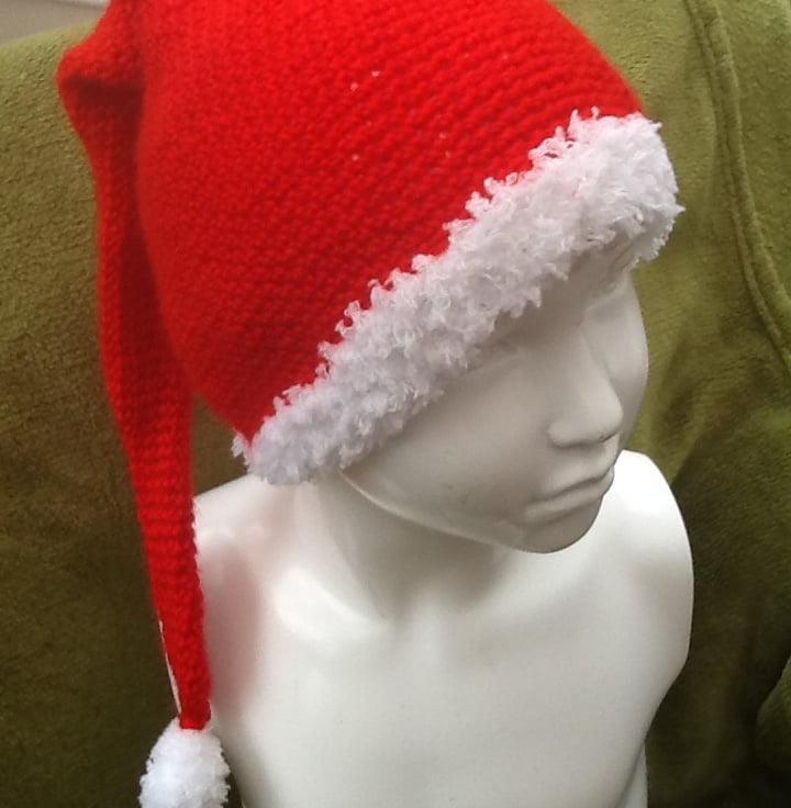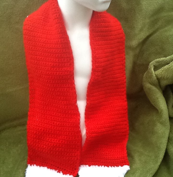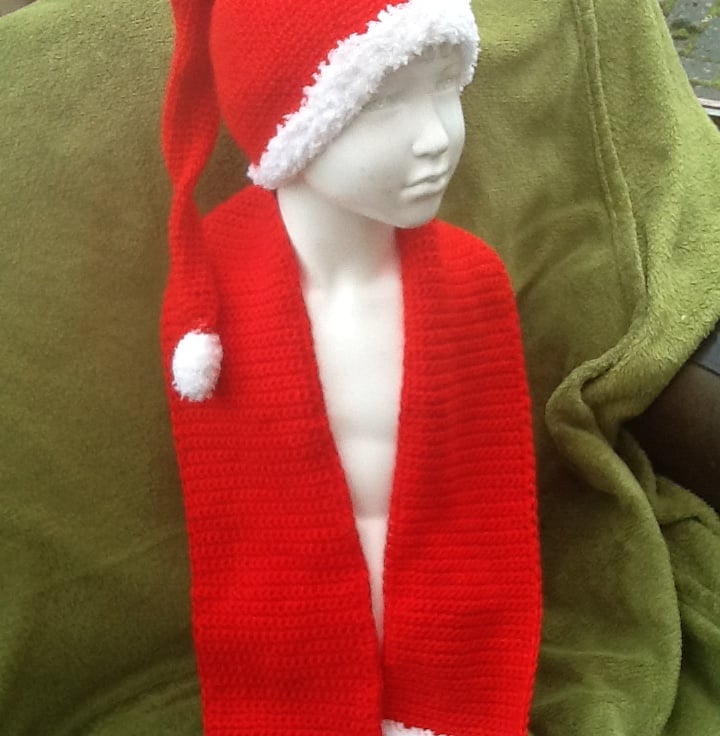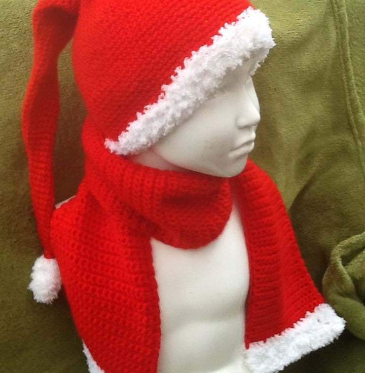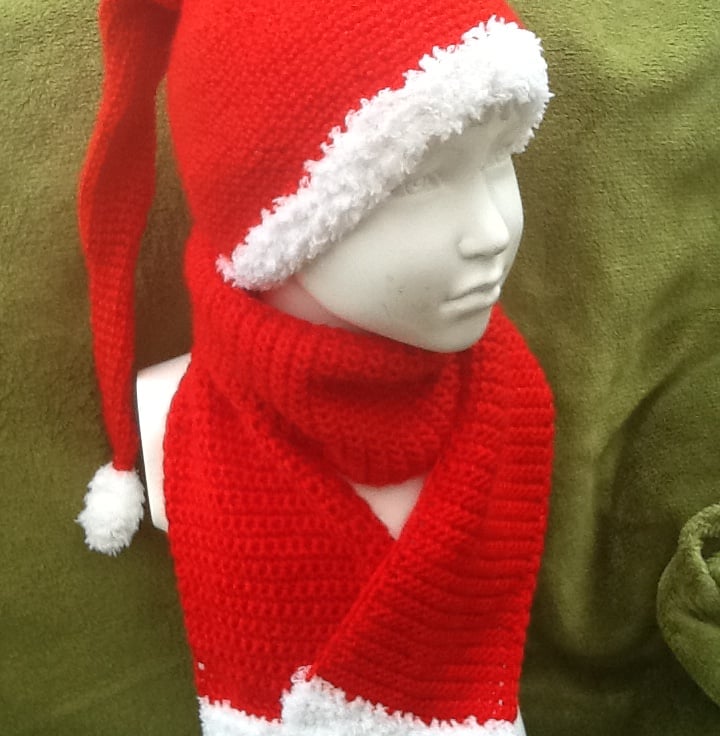 A lovely Christmassy set, with simple scarf and to crown it all, a little Santa hat, crocheted in a continuous line, starting at the tip of the point and increasing in width into the body of the hat. Trimmed in the super soft fluffy white yarn, with a crocheted bobble, securely sewn to the end.
