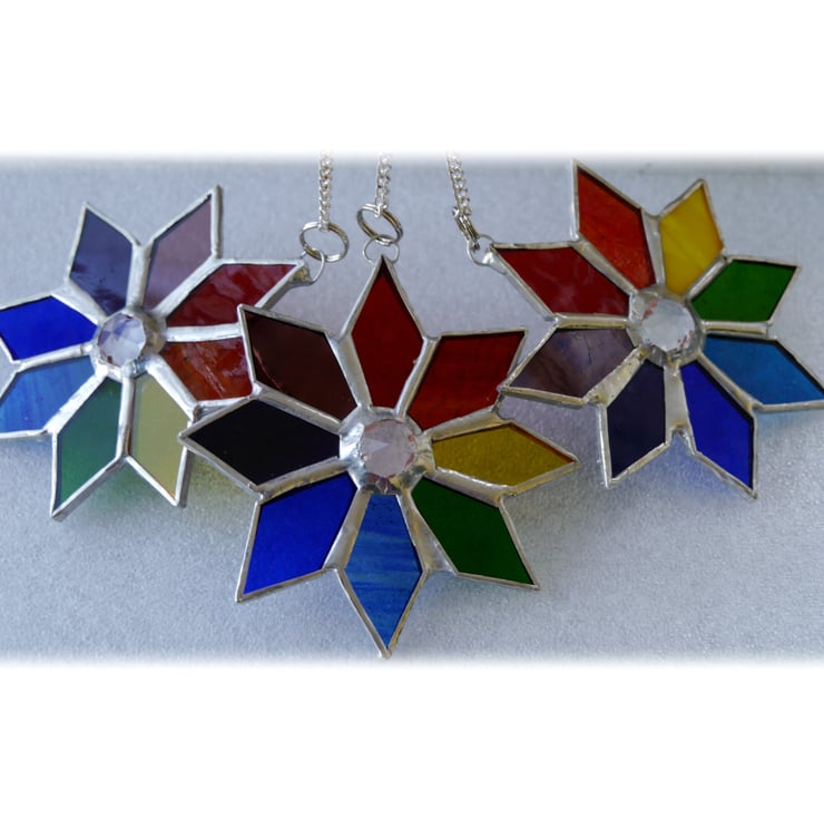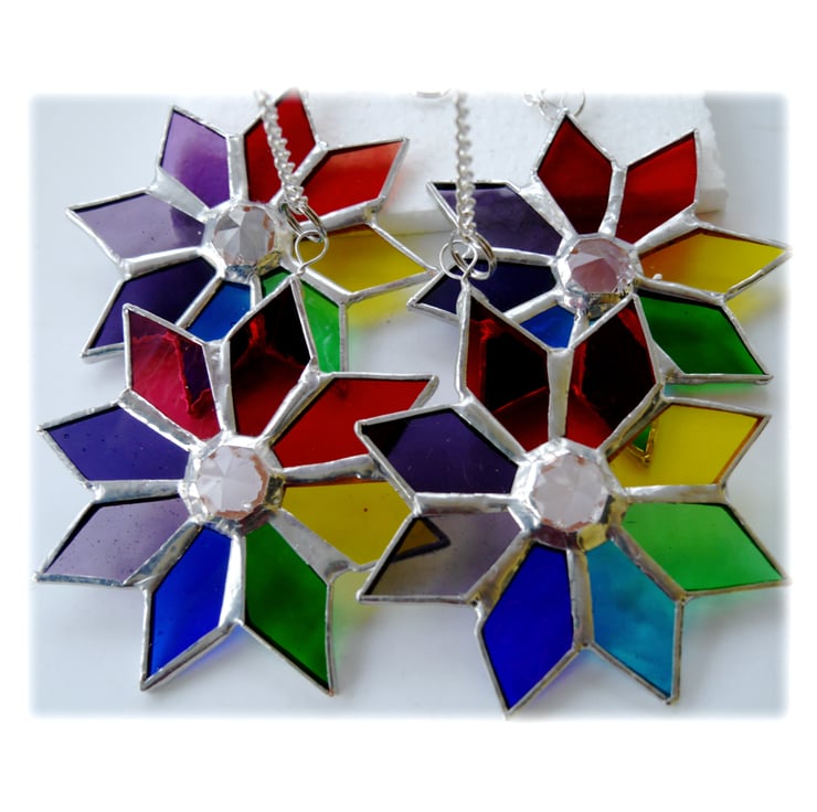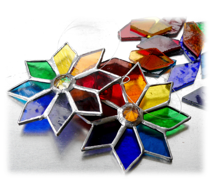 An 8 point star formed from rainbow colours. In the centre is a very sparkly glass crystal.