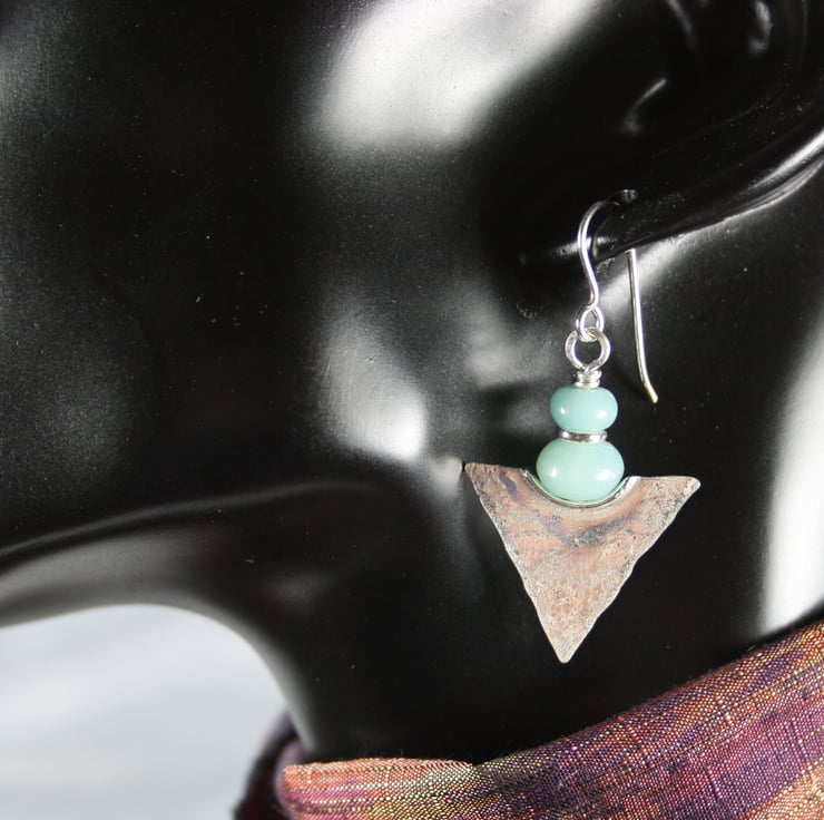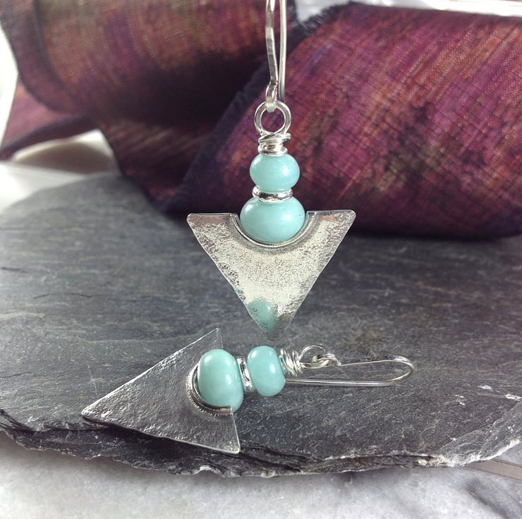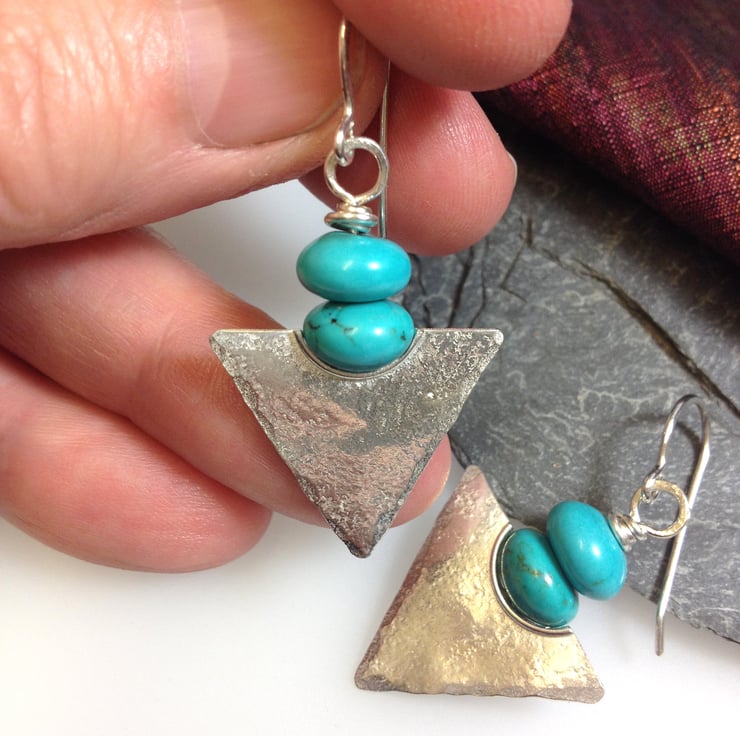 Lightweight triangular dangly earrings topped with two bright turquoise rondelle beads.