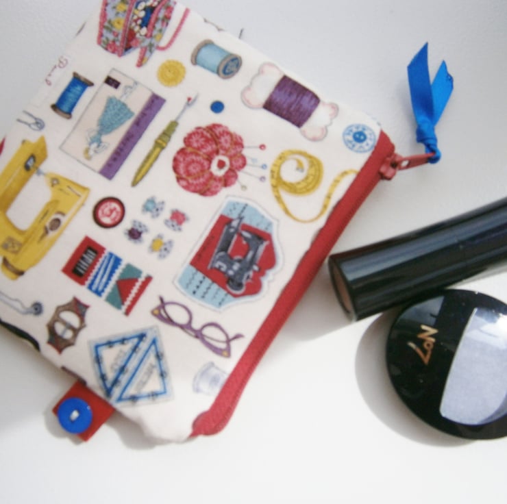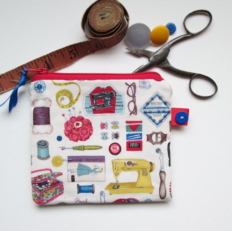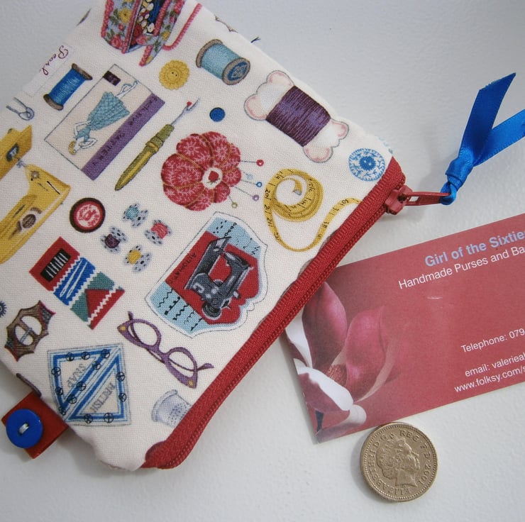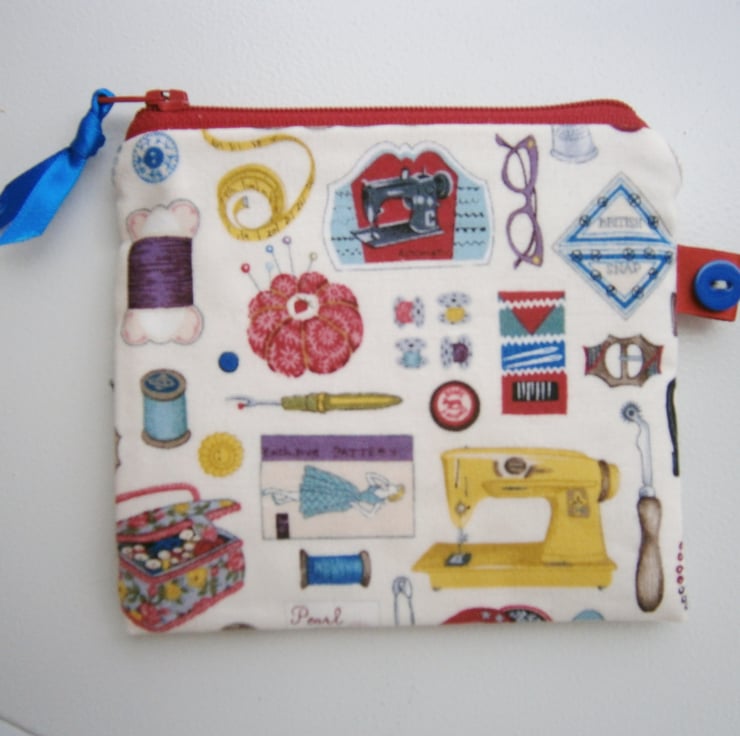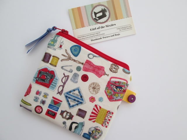 Pretty little vintage sewing design printed fabric coin purse, perfect for your coins, notes and cards.