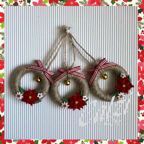 This set of three mini wreaths has been made from repurposed wooden curtain rings, wrapped with jute string, I then added my handmade poinsettia and daisy clay flowers and finished with a gold jingle bell and a red and white ribbon bow.