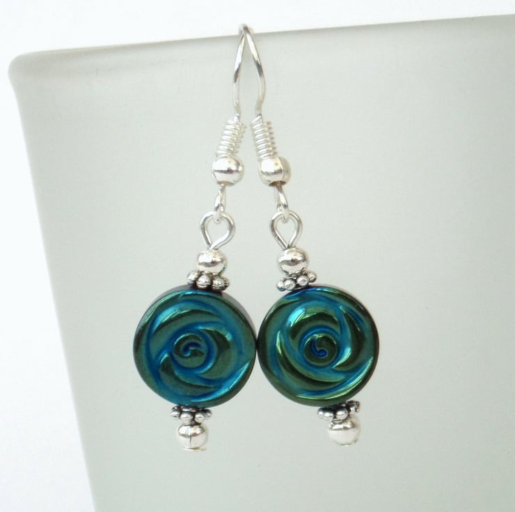 Lovely coin-shaped hematites, plated with a green/blue metallic coating, are the focal point of this lovely earrings.