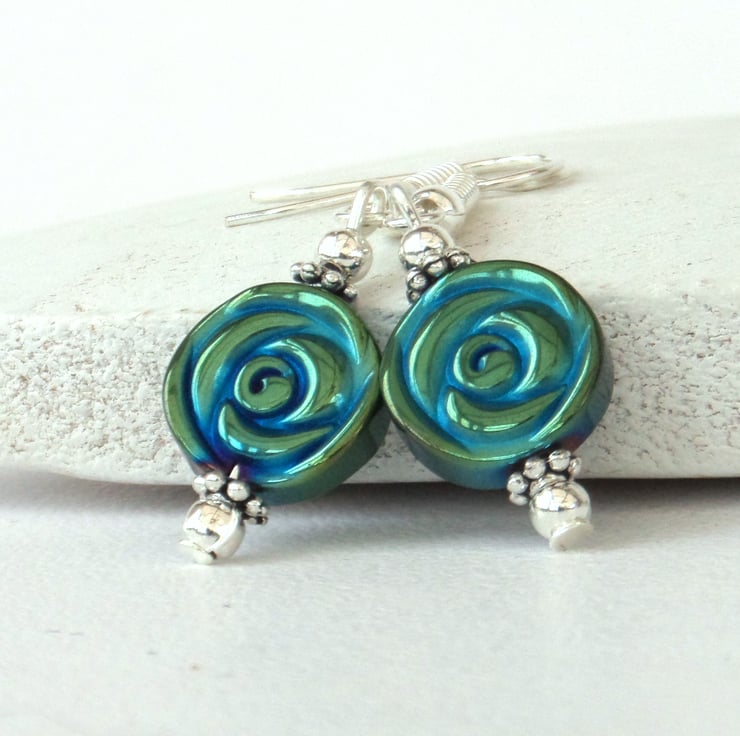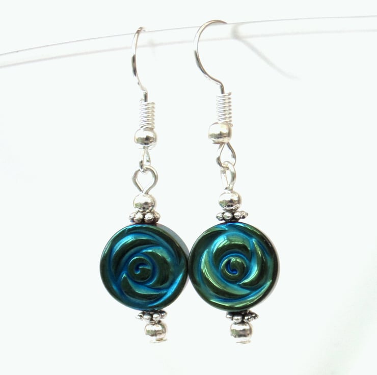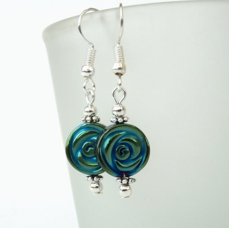 Lovely coin-shaped hematites, plated with a green/blue metallic coating, are the focal point of this lovely earrings.