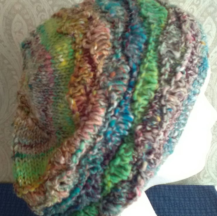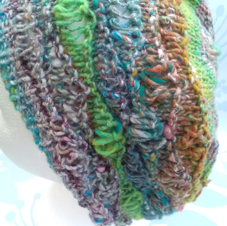 This yarn has been perfect for the lacy stitch and has made a lovely texture with silk cotton mix. The colours are broken enough to show a more subtle colour change in the stripes.