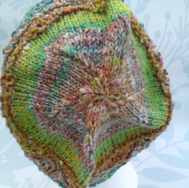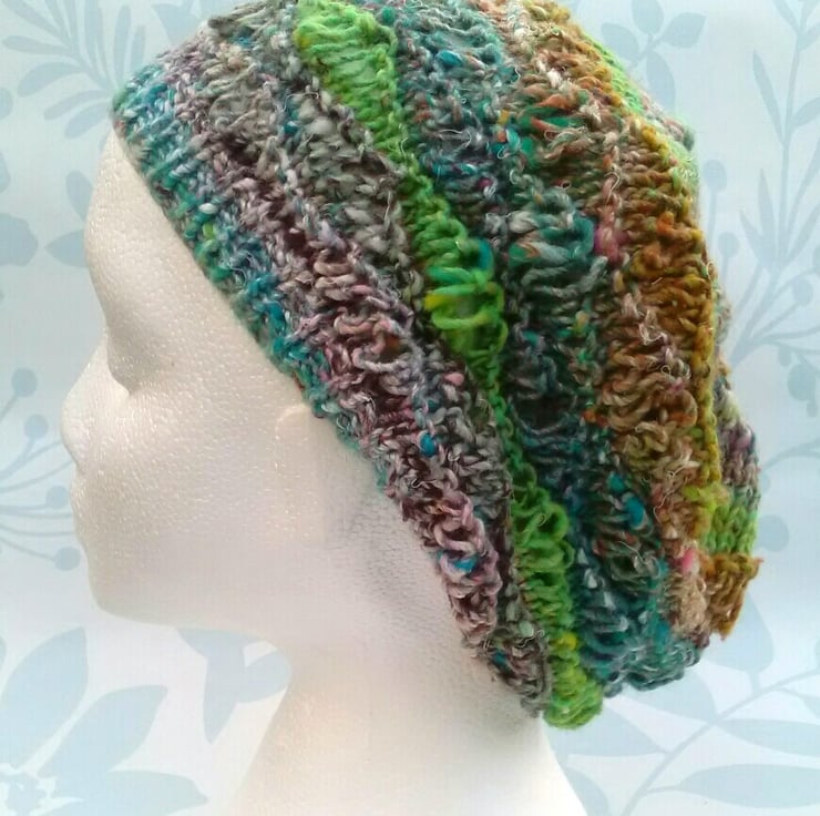 Made from a lovely, slubby, lightweight cotton, silk and wool blend yarn from NORO, I have designed a Lacy Beret which covers the ears and sits back off the head. It stays on through the rib edge and has a great slouch look.