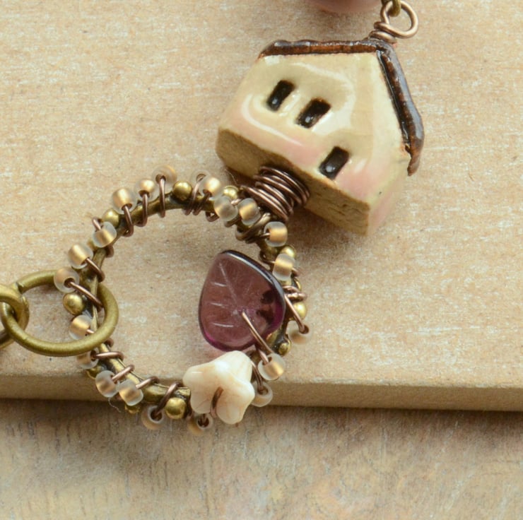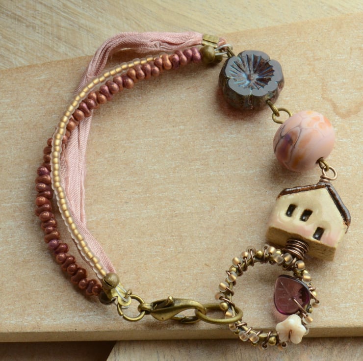 Handmade Bracelet made using beautiful peach ceramic house bead from Elukka Ceramics with my own beaded connector, beautiful etched lampwork bead from UK Artist Lorna Johnston, Czech blossom and 3 strands, one sari ribbon, one gold lined seed beads and one lustre burgundy seed beads.