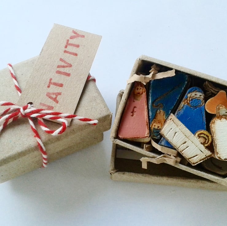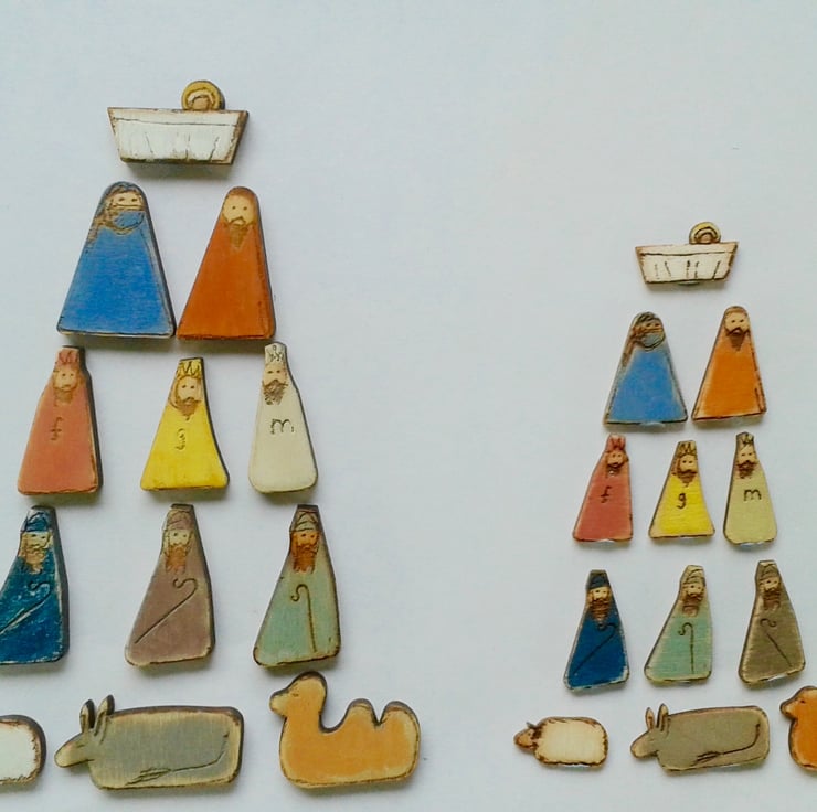 This little Nativity is made from fsc birch plywood and is cut from my original drawings. This is a quirky addition to the festive period. There are twelve pieces to include Jesus, Mary, Joseph, three kings, three shepherds, camel, donkey, lamb. They are all handpainted by me on both sides, sanded with a protective finished applied. It comes in a little paper mache box.
