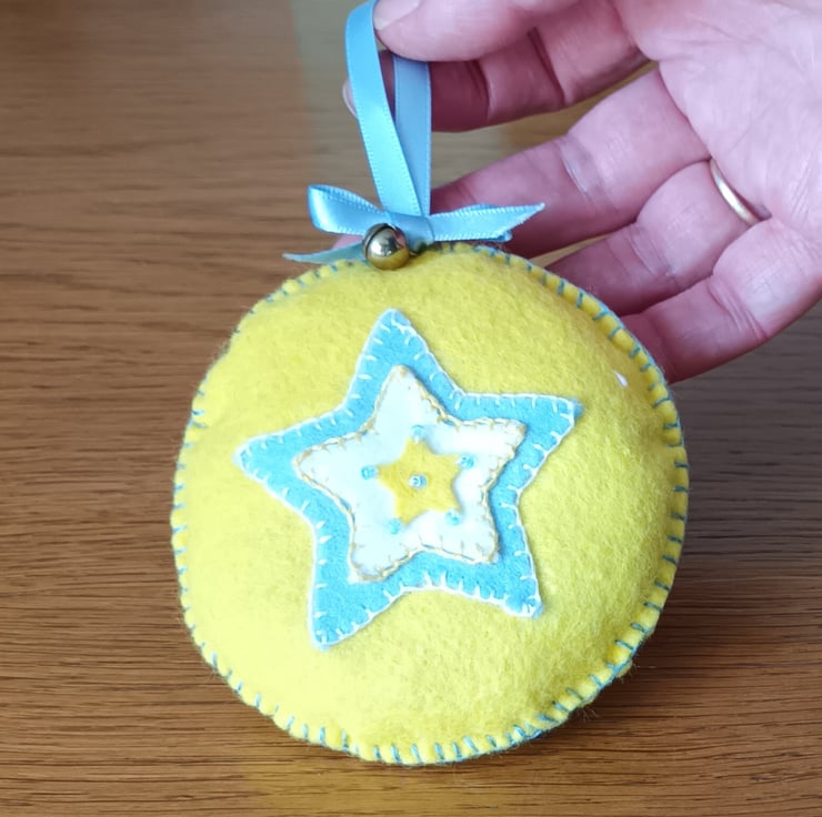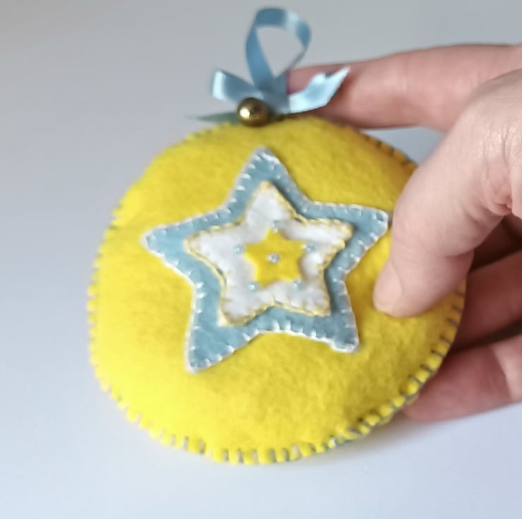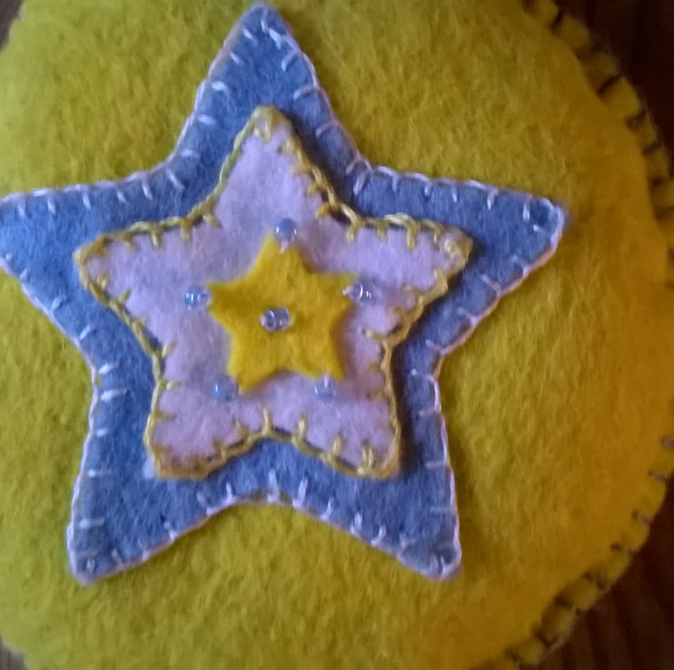 A pretty circular felt decoration with stars, seed beads and jingle bells all hand sewn and lightly stuffed .