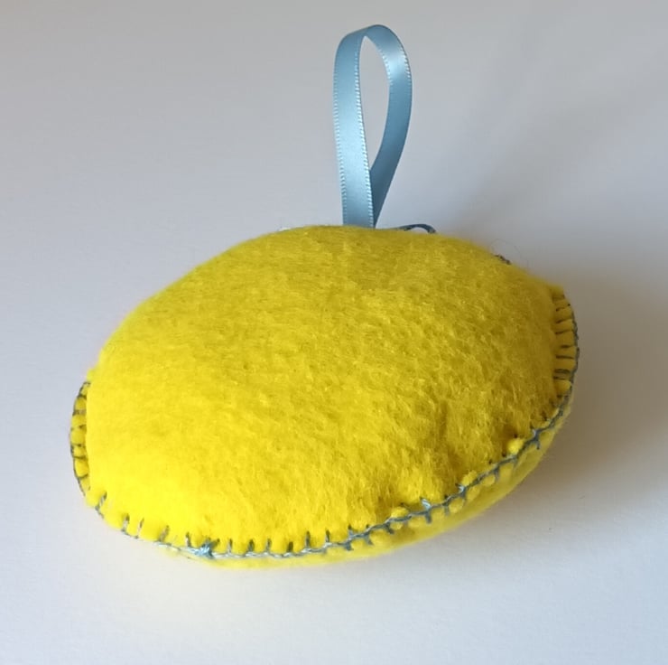 I have attached a blue ribbon loop and bow and a gold jingle bell to the top of the decoration to finish.