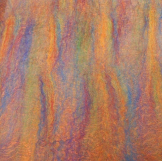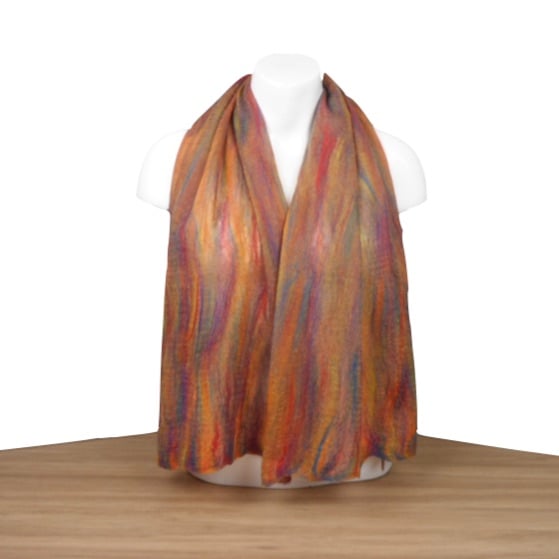 A gorgeously soft and lightweight scarf made using a blend of merino wool in a rainbow of colours nuno felted onto an orange silk chiffon base fabric. The nuno felting process causes the woollen fibres to penetrate the silk and bind with it creating a new fabric.