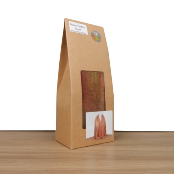 The scarf is presented in a good quality kraft card window box with labelling to explain the nuno felting process and give washing instructions. This scarf is an ideal gift for any occasion.