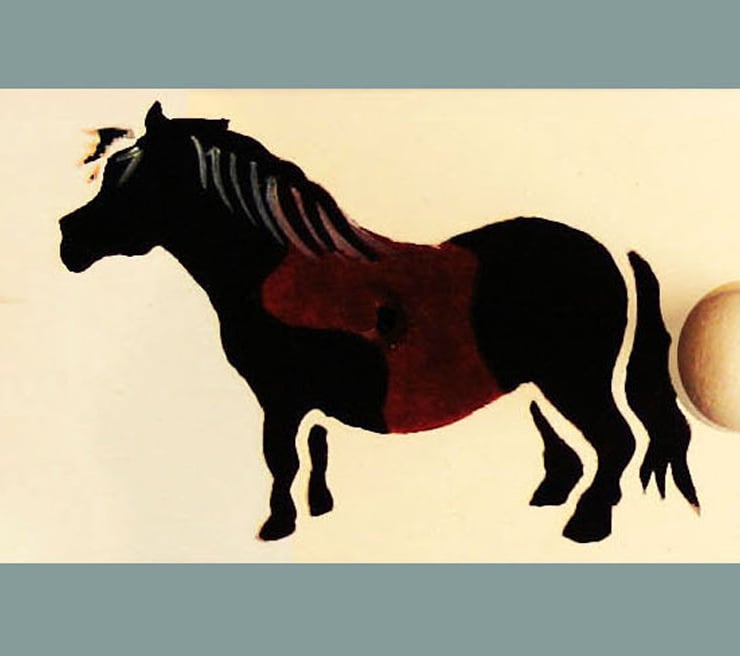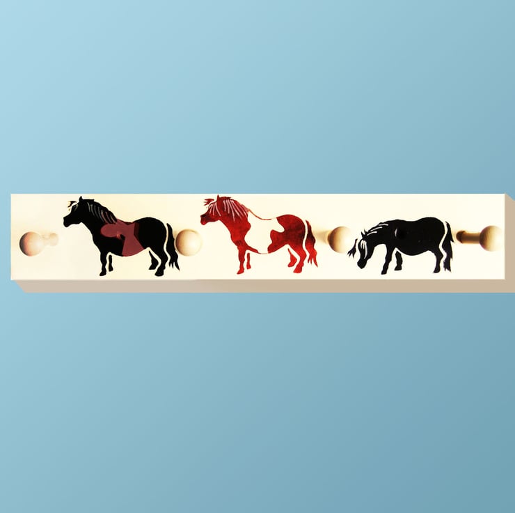 This pegboard will make a special gift for lovers of adorable Shetland ponies, or for a child's Birthday. It is decorated with three different and lovable ponies. It will make an eye catching addition to a hallway or child's nursery.