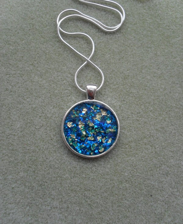 Handmade Resin pendant with blue resin and blue glitter particles and gold coloured leaf which give a lovely effect and sparkle then having a layer of clear resin on the top