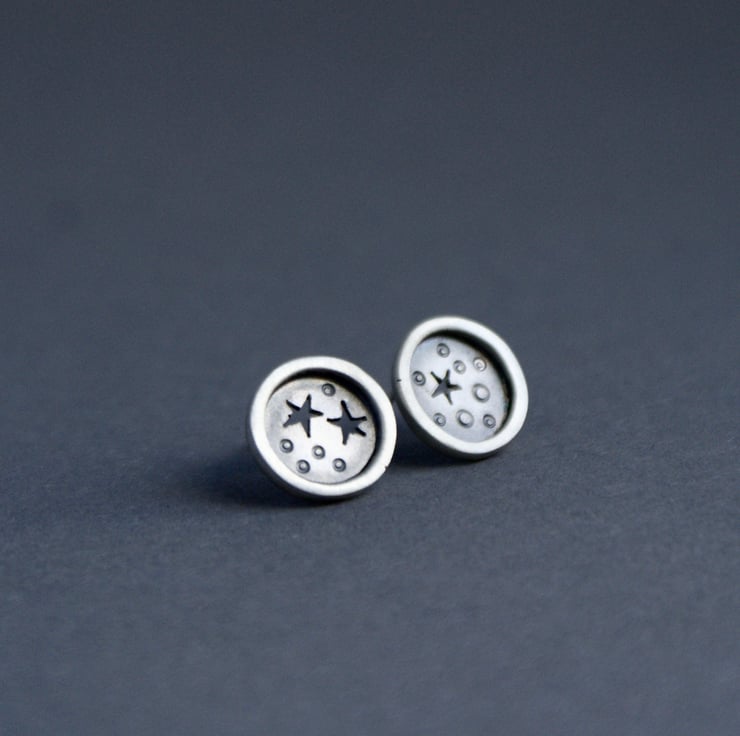 A cute pair of handmade mismatched silver earrings featuring little stars. The seedlings have been cut out using a piercing saw and the surface of the metal has been textured with little circles. The studs have then been oxidised and rubbed back to create depth. Please note each pair may vary slightly from the image as each pair are completely hand made.