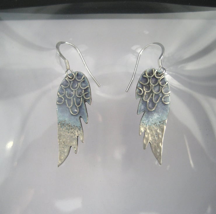 I have enamelled the top half of the wings in soft violet, fired them to 800 degrees C,added sterling silver wires, cut and shaped to give feathers and re-fired approx. 6 times. Highly polished, sterling silver fish hook ear wires added and...voila!!