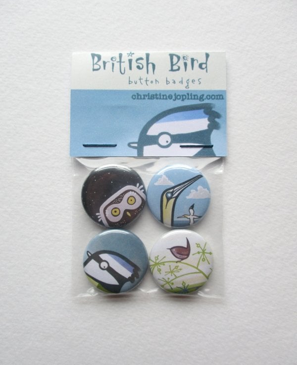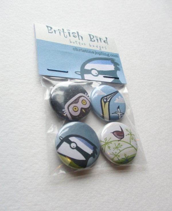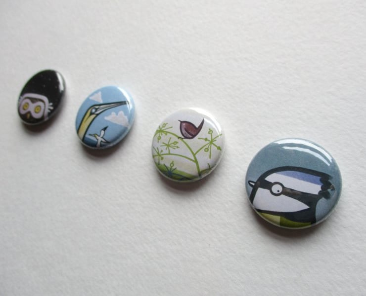 The badges are made locally in Leeds by trained professionals, and designed and packaged by me. The designs are taken from paintings I've created. Some are still available to buy, as originals or prints, if you want something bigger!