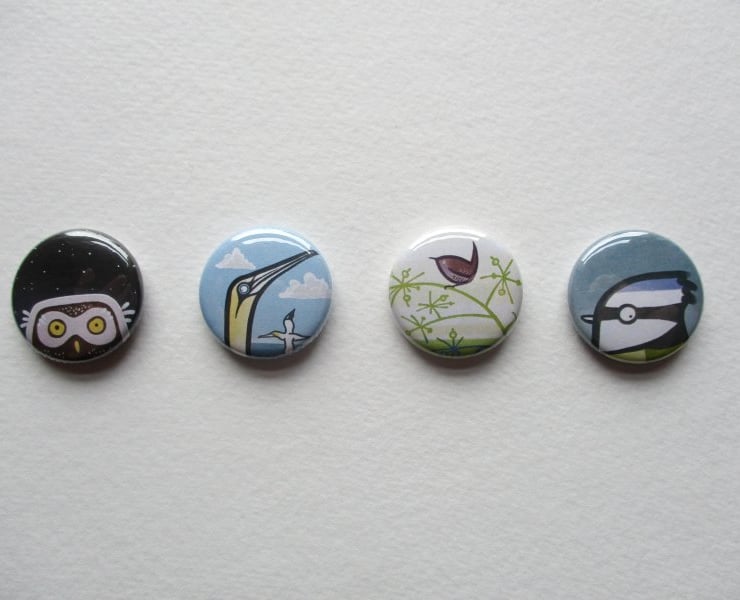 A set of four little badges – approx. 25mm (1 inch) across – the original button badge! Shiny, full colour and made with high quality metal components.