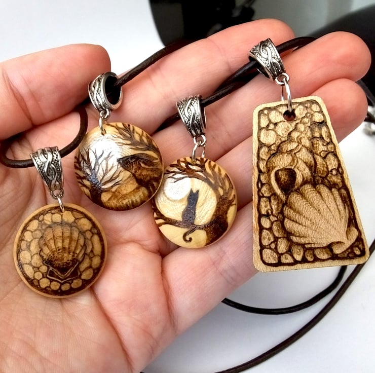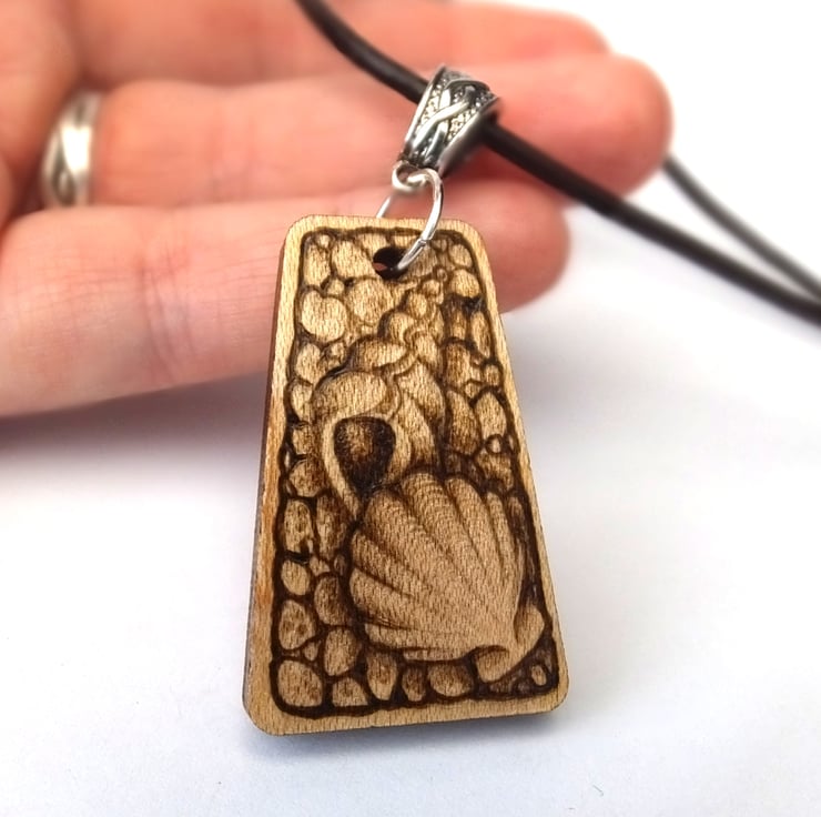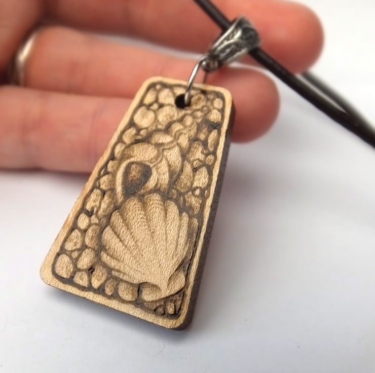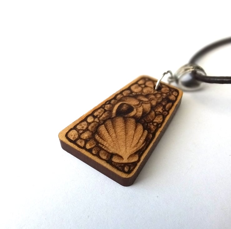 This listing is for a beautiful triangle pyrography pendant, featuring sea shells on a pebble beach.
