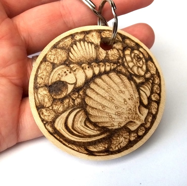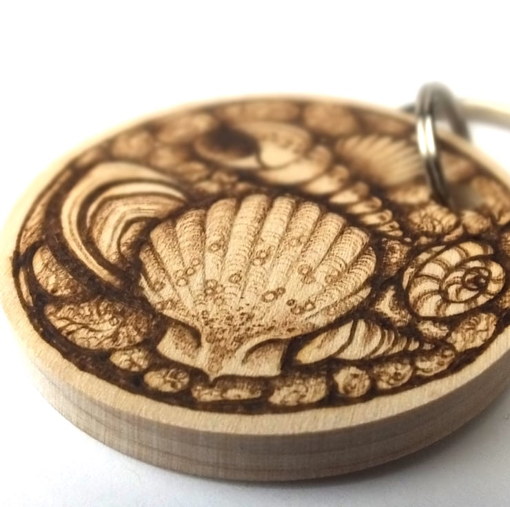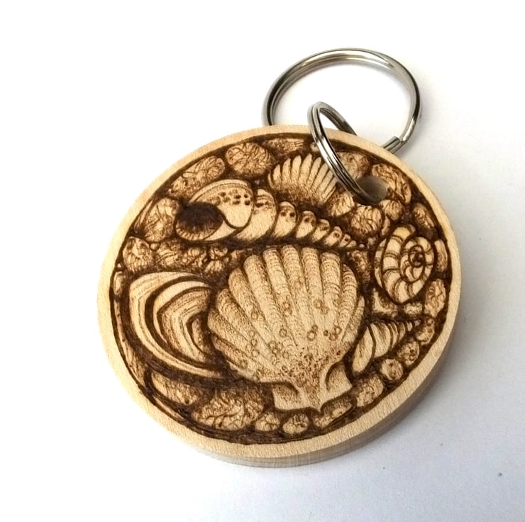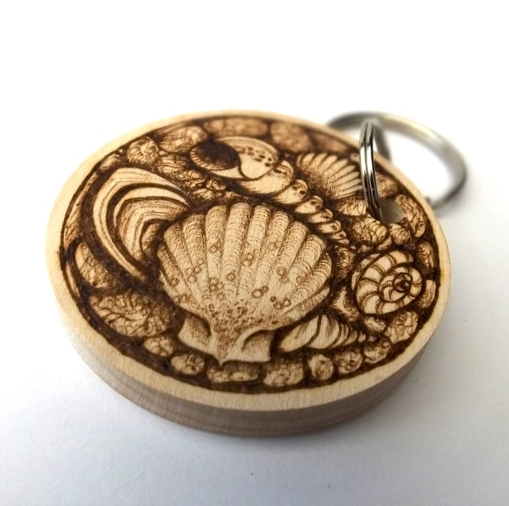 This listing is for a chunky wooden keyring decorated with a collection of shells, it is made and ready to post. I can put a name and/or date etc. on the reverse.