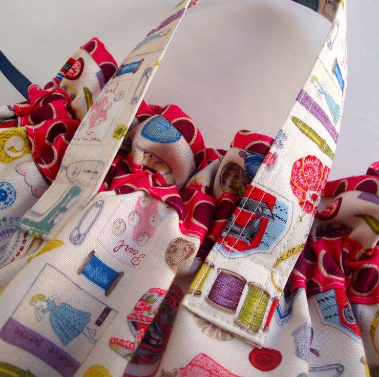 Handmade in a lovely printed cotton fabric , & a contrast fabric for making the drawstring channel . I used the same fabric for the lining .