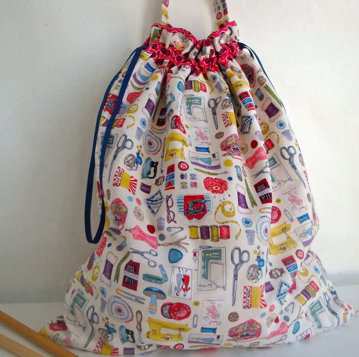A very pretty handmade Craft bag , ideal for storing any type of craft you have on the go - Knitting Crochet - Embroidery etc. With a handy carry strap , it's ideal to take to & from Craft club .