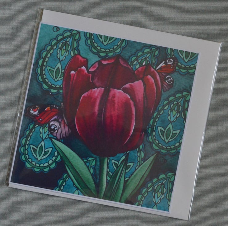 Blank greeting card for any occasion featuring a tulip flower with peacock butterflies and paisley design background