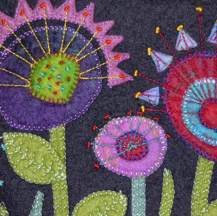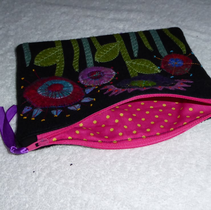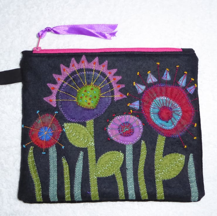This lovely little purse has been created using machine and hand applique of felt flowers, stitched onto a wool rich black felt background. The felt flowers are cut from pieces of hand made, wet felted flat pieces, so have depth in colour and texture.