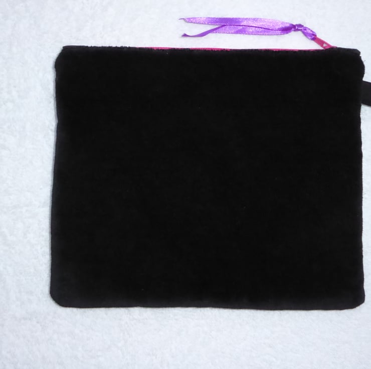 The purse is backed in cotton velvet, and fully lined in a complimentary cotton, with a zip closure and a ribbon pull.