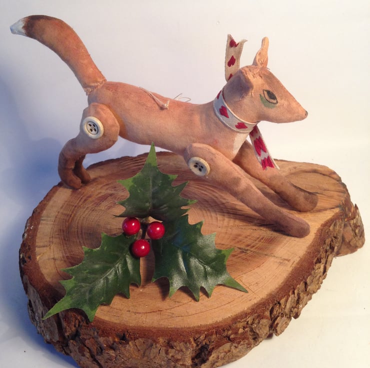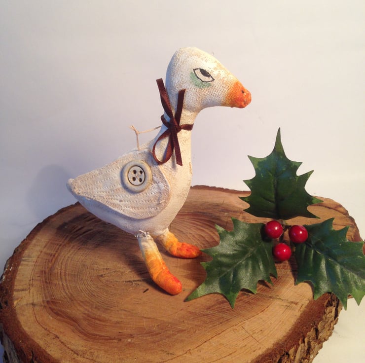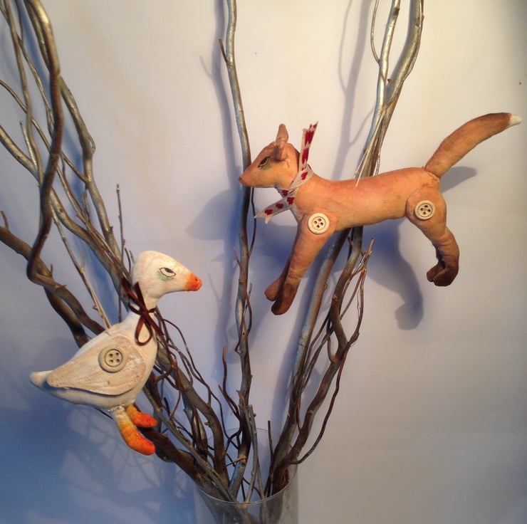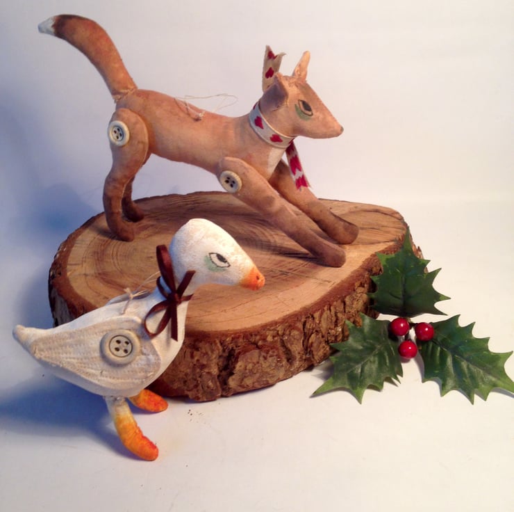 This set of two hanging Christmas decorations have been hand and machine stitched and hand painted to give an aged primitive style. Around fox's neck is a scarf with red hearts and goose who would never be out done wears a satin ribbon of chocolate brown. Each of the friends has a Victorian bone button on each leg and wing.
