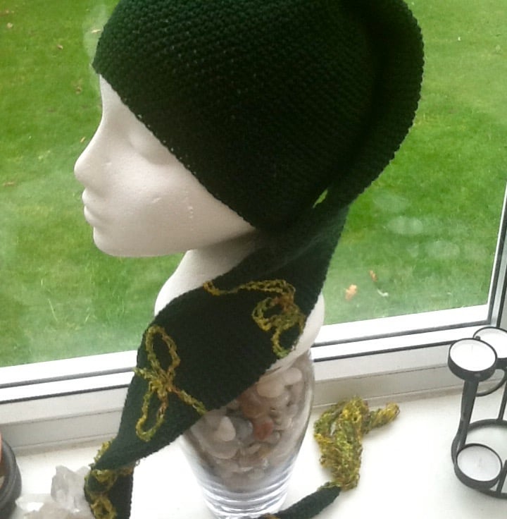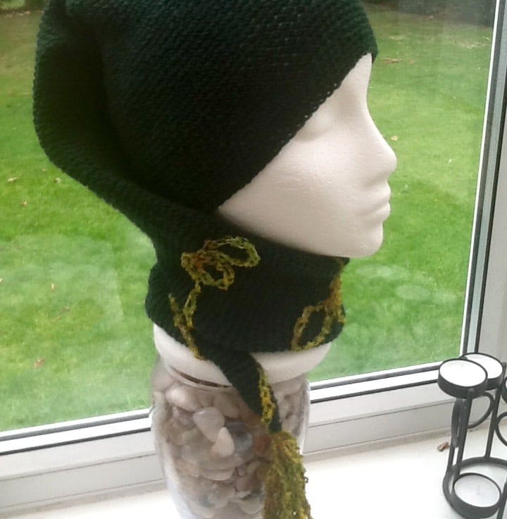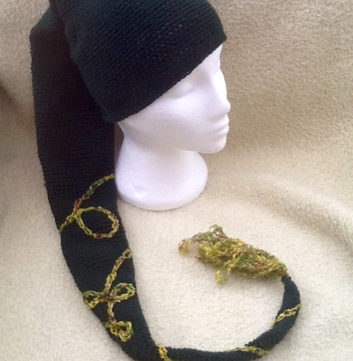 Deep Bottle Green Elf style long Crocheted Hat scarf with Crocheted looping contrasting appliquéd design & tassel detail, to give it that little finishing touch!