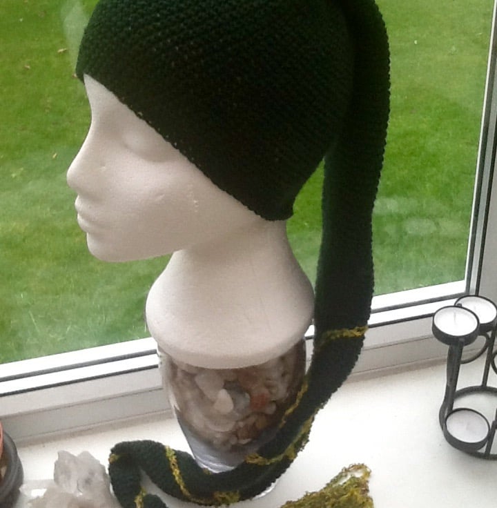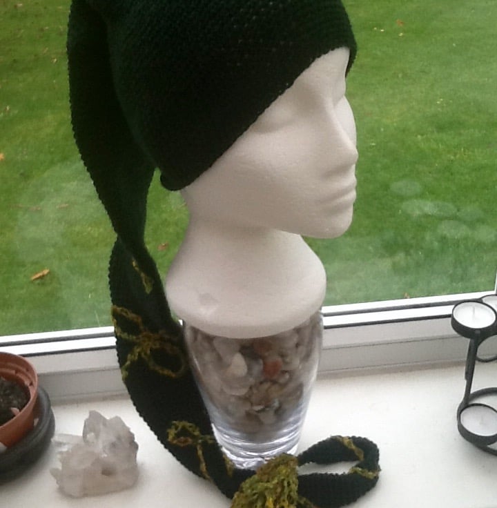 The whole of the hat is crocheted in deep bottle green 100% acrylic yarn, the looping design & tassel is crocheted in a woodland green tones mixed blend yarn & securely sewn to end tip of the hat, extending mid way along the central body.