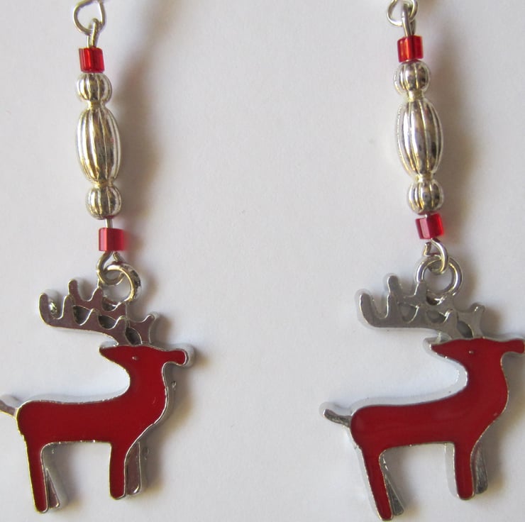 Fun pair of Christmas red stag / deer earrings with red and silver tone beads on silver plated ear wires.