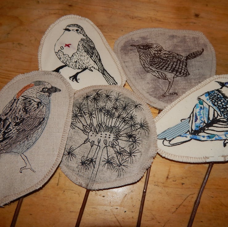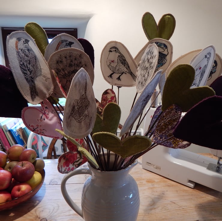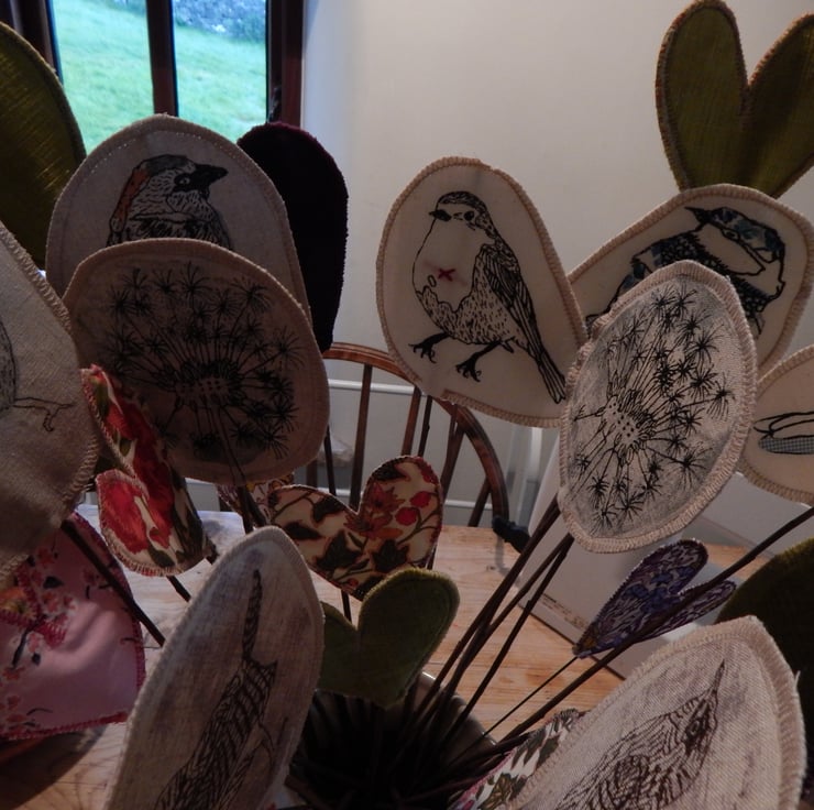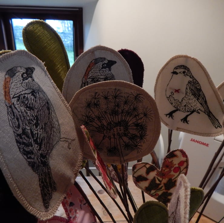 This is a bouquet of fabric and willow flowers that I have screen printed birds and dandelion clocks onto. There are 12 birds and dandelion clocks, the birds are wren, robin, blue tit and sparrow. The robin has a hand embroidered red cross on his chest, and the bluetit some applique to his feathers.