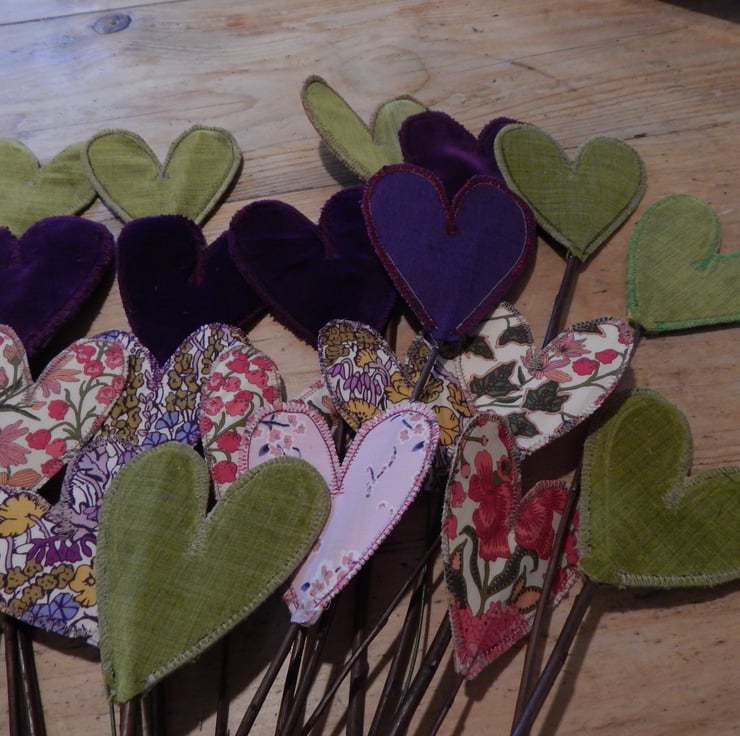 There are 20 mixed hearts in green, purple and floral patterned, with velvet and cotton. The stems measure 42cm or less from willow base to top of fabric.