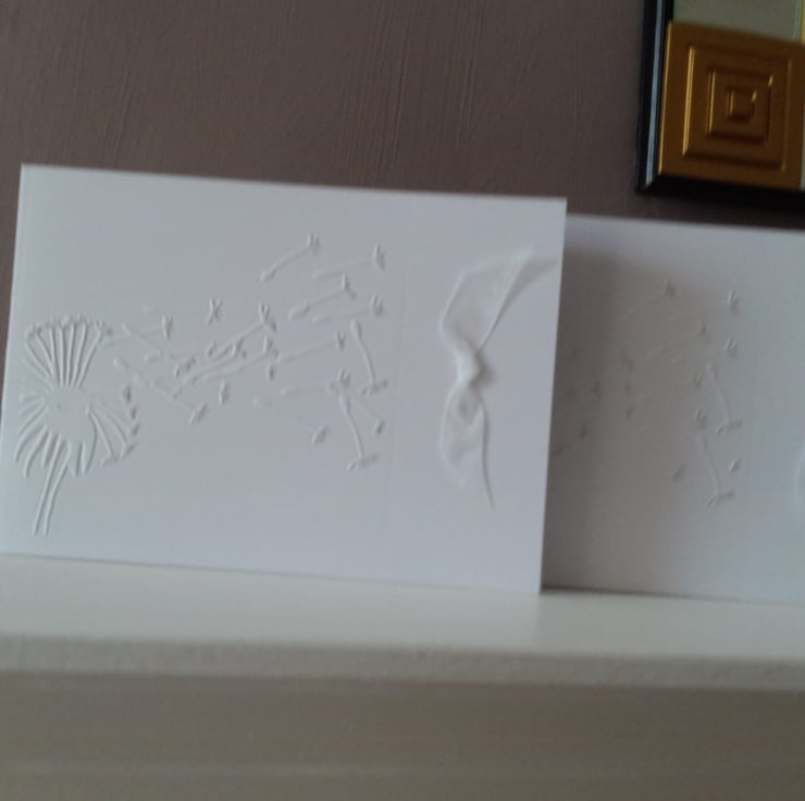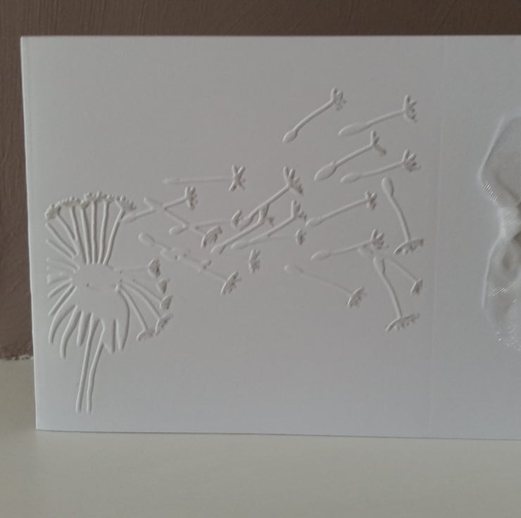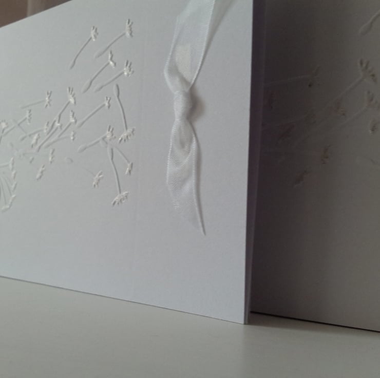 Completely handmade and uniquely designed pack of 4identical cards/notelets. Consisting of quality pristine white card which has been embossed with a beautiful dandelion design. The seed heads have been embellished with subtle silver glitter. Finished off with a white organza bow.