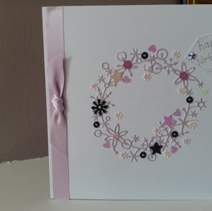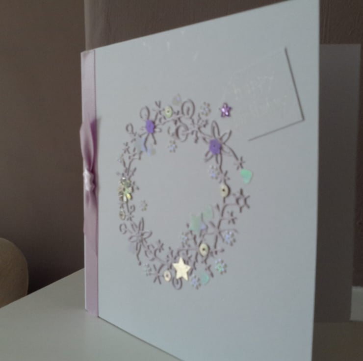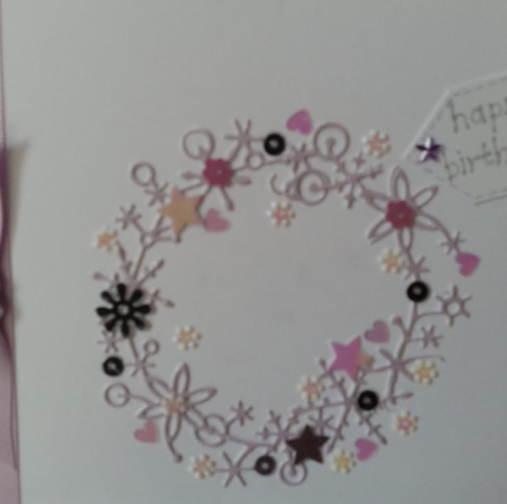 A completely handmade and uniquely designed card. Consisting of pristine white quality card which has a die cut circle of flowers and stars and swirls from pale lilac pearl card. This has been embellished with sequins, stars, hearts, flowers. A happy birthday tag has been added. Finished off with a ribbon and how from orchid coloured satin ribbon