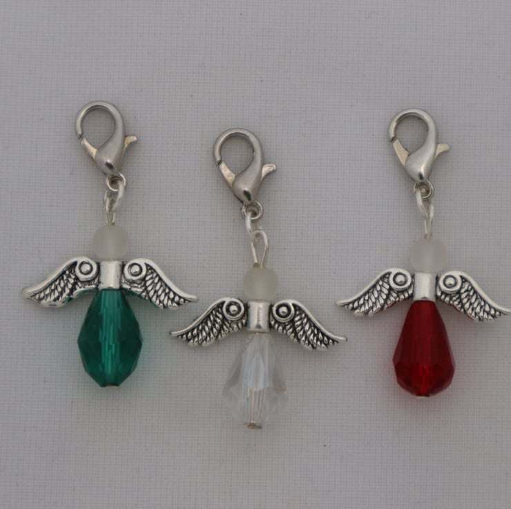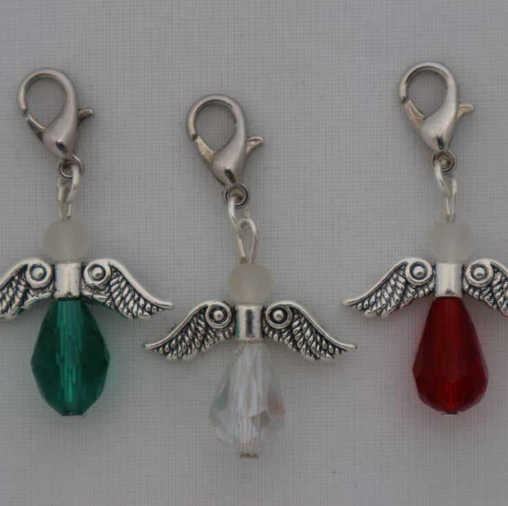 A set of 3 handmade crochet stitch markers in festive colours in an angel design. These are great to keep track of your stitch numbers and rows when crocheting, they just clip on the relevant stitch. They are also very pretty and will brighten up your crochet projects.