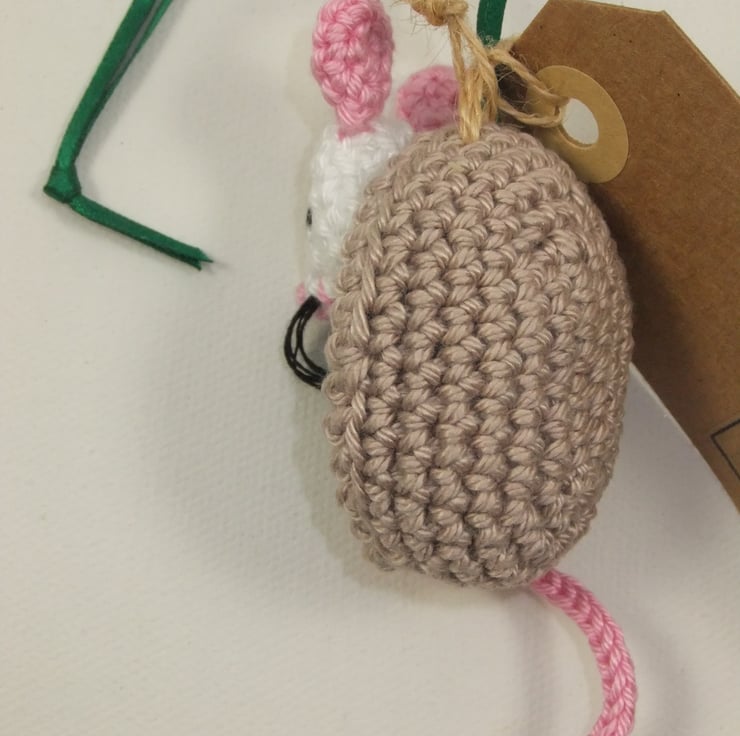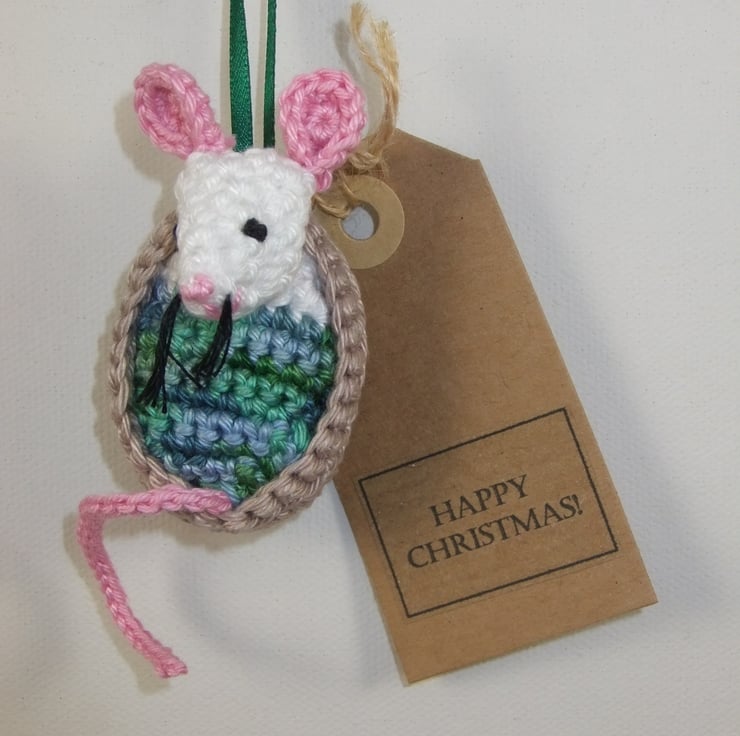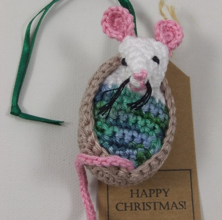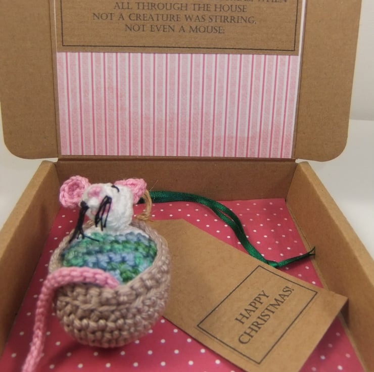 A cross between a greeting and a gift, this messenger mouse is a sweet bearer of a Christmas greeting this year and a lovely tree decoration for many years to come! The mouse and its cosy walnut shell bed have been crocheted in cotton. The shell is stuffed with polyester filling and the whole decoration hangs from a narrow satin ribbon. It comes in a labelled and lined PIP (Postage in Proportion) box all ready to be given or posted in style. There is a quotation of the first two lines of ‘Clement Clarke Moore’s famous poem inside the lid of the box and the tag on the decoration currently reads ‘Merry Christmas!’ although I am happy to replace this tag with one bearing a greeting of your choice. The mouse might be quite offended by his journey at large letter rather than small parcel rate, but will just need a little plumping to recover his spirits!
