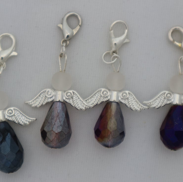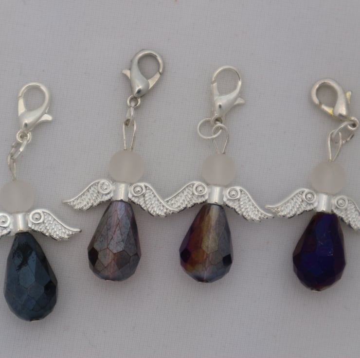 A set of 4 handmade crochet stitch markers in deep colours in an angel design. These are great to keep track of your stitch numbers and rows when crocheting, they just clip on the relevant stitch. They are also very pretty and will brighten up your crochet projects.