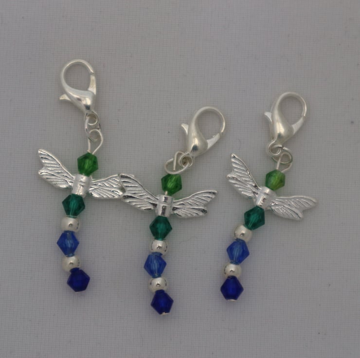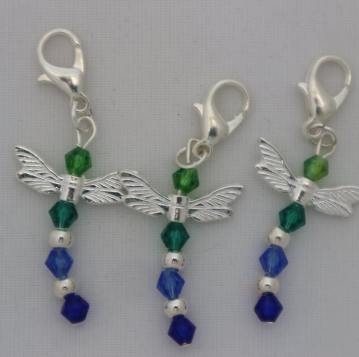 A set of 3 handmade crochet stitch markers in watery colours in an a dragonfly design. These are great to keep track of your stitch numbers and rows when crocheting, they just clip on the relevant stitch. They are also very pretty and will brighten up your crochet projects.