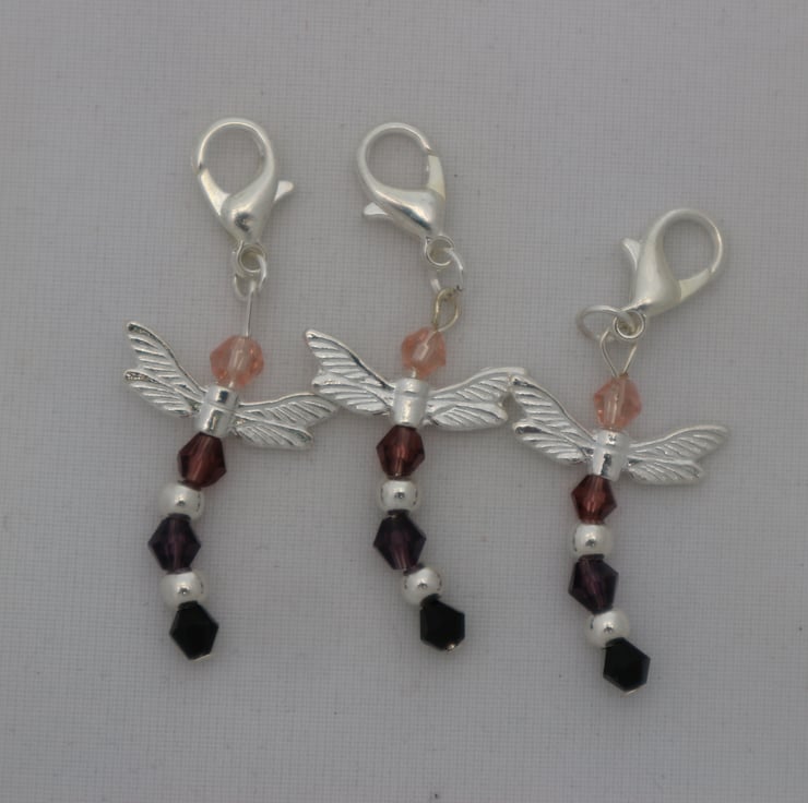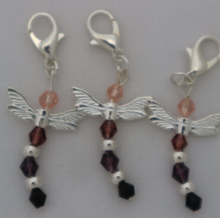 A set of 3 handmade crochet stitch markers in watery colours in a dragonfly design. These are great to keep track of your stitch numbers and rows when crocheting, they just clip on the relevant stitch. They are also very pretty and will brighten up your crochet projects.
