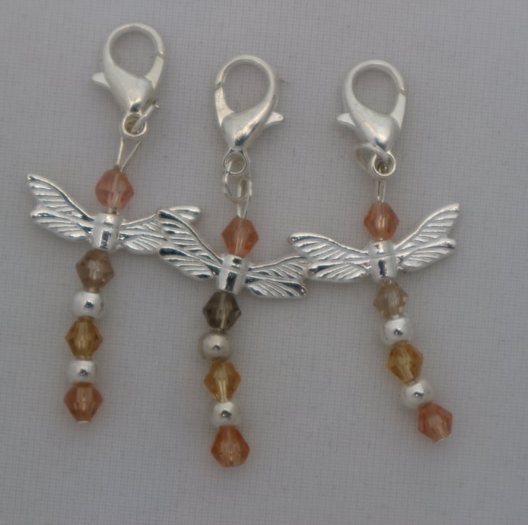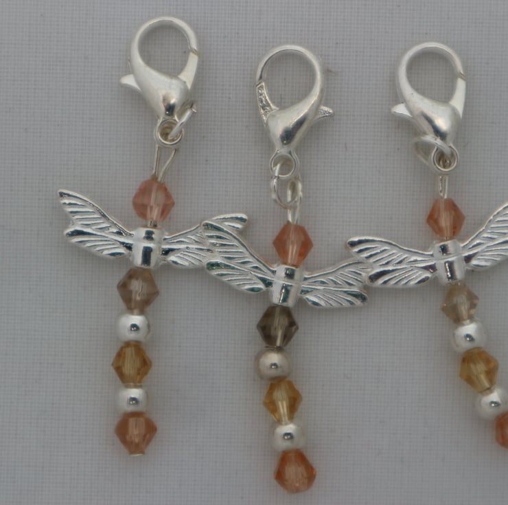 A set of 3 handmade crochet stitch markers in watery colours in a dragonfly design. These are great to keep track of your stitch numbers and rows when crocheting, they just clip on the relevant stitch. They are also very pretty and will brighten up your crochet projects.