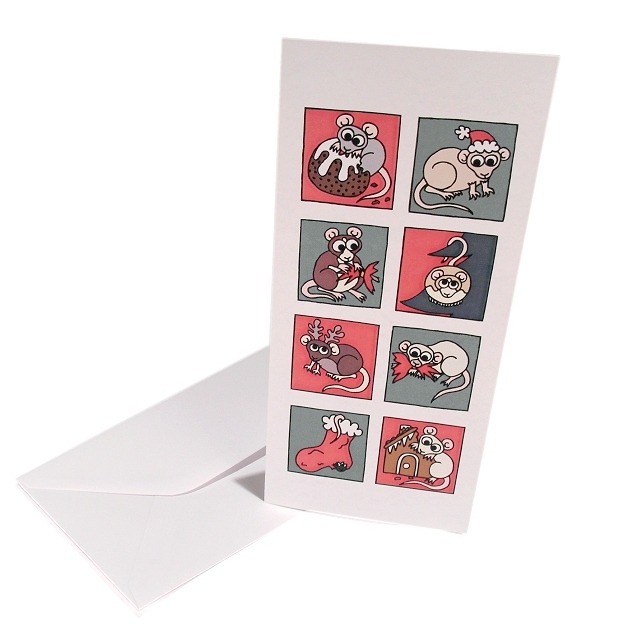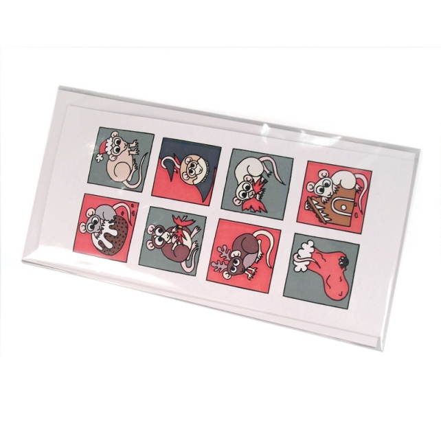 This original rat design is by Kim Onyskiw and is printed on a 105mm x 210mm (DL) long card. The card is blank inside for your own message and will come with a white envelope.